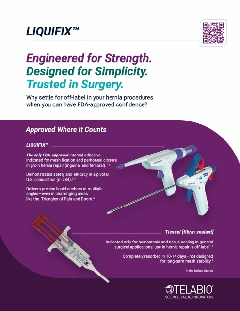LIQUIFIX™ atraumatic mesh fixation for both open and minimally invasive inguinal and femoral hernia repair.
